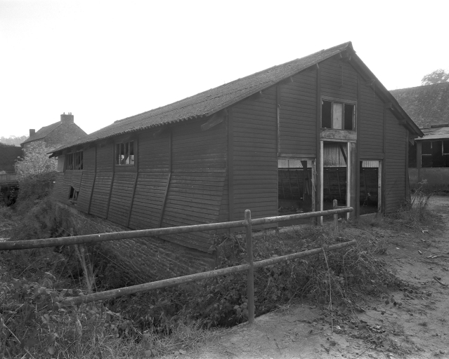 Atelier de menuiserie en essentage de planches, le long duque coule le canal de fuite, masqué par la végétation.Immatriculation