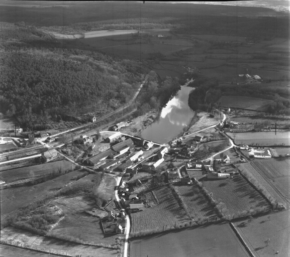Vue aérienne générale ouest : logement patronal et chapelle à gauche ; ateliers de production en aval de l'étang avec la fonderie, au centre (1982).Immatriculation