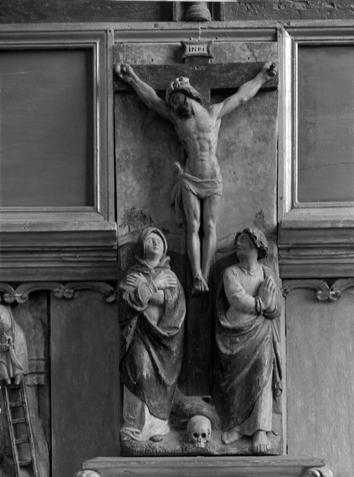 Autel et retable sud, panneau sculpté : Crucifixion.Immatriculation