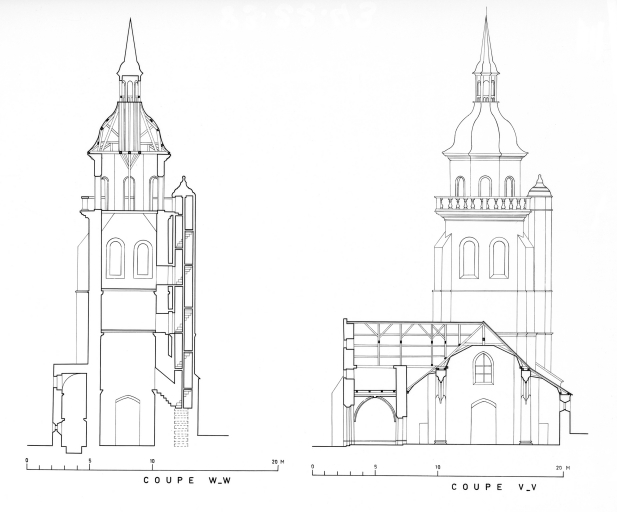 Eglise paroissiale : coupe sur clocher, coupe transversale sur la nef et le porche sudImmatriculation