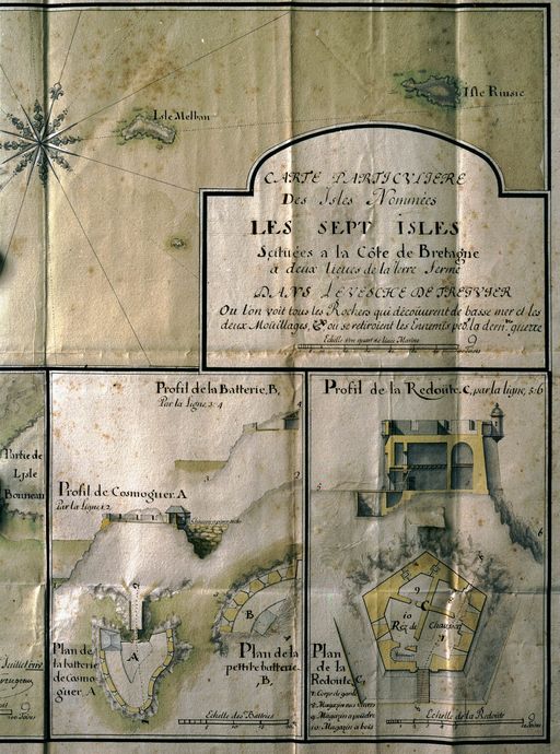 Plan du projet de la batterie de Cosmoguer et redoute de l'île aux Moines par Garangeau daté du 15 juillet 1718Immatriculation