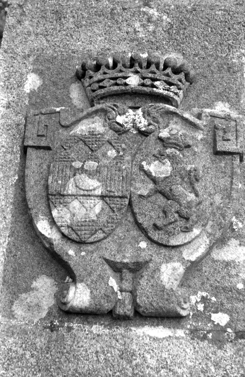 Vue de l'un des piliers de l'entrée : détail des armoiries (état en 1983)Immatriculation