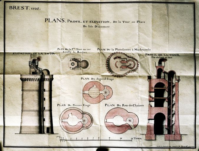 Plans, profil et élévation de la tour ou phare de l'île d'Ouessant, fait à Brest par Casantin de Saccardi, ingénieur en 1736Immatriculation