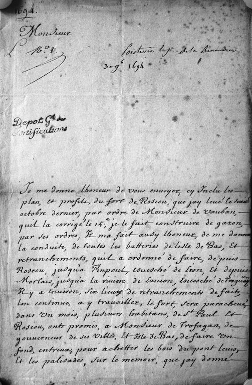 Service Historique de la Défense du Château de Vincennes : Archives du Génie, Article 8, Roscoff, Places abandonnées, lettre du 30 novembre 1694.