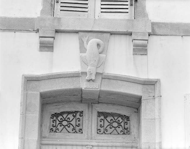 Logis daté 1880 aujourd'hui disparu, détail de la clé d'arc : poisson stylisé et date portée. (1983)Immatriculation