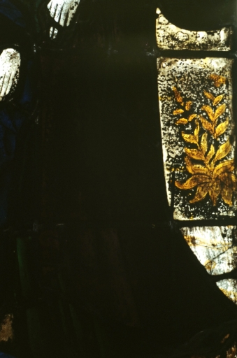Verrière 1 après restauration, vue prise en atelier Briand à Rennes : panneau 1c, détail de la partie droite.Immatriculation