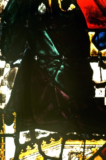 Verrière 1 après restauration, vue prise en atelier Briand à Rennes : panneau 2b, partie supérieure.Immatriculation