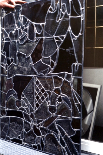 Verrière 1 après restauration, vue prise en atelier Briand à Rennes : panneau 2b, revers, vue d'ensemble biaise.Immatriculation