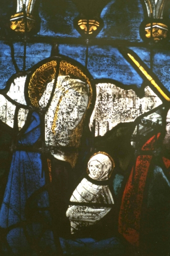 Verrière 1 après restauration, vue prise en atelier Briand à Rennes : panneau 3c, Fuite en Egypte, détail de la Vierge et de l'Enfant.Immatriculation