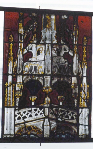 Verrière 1 après restauration, vue prise en atelier Briand à Rennes : panneau 5c, vue d'ensemble.Immatriculation