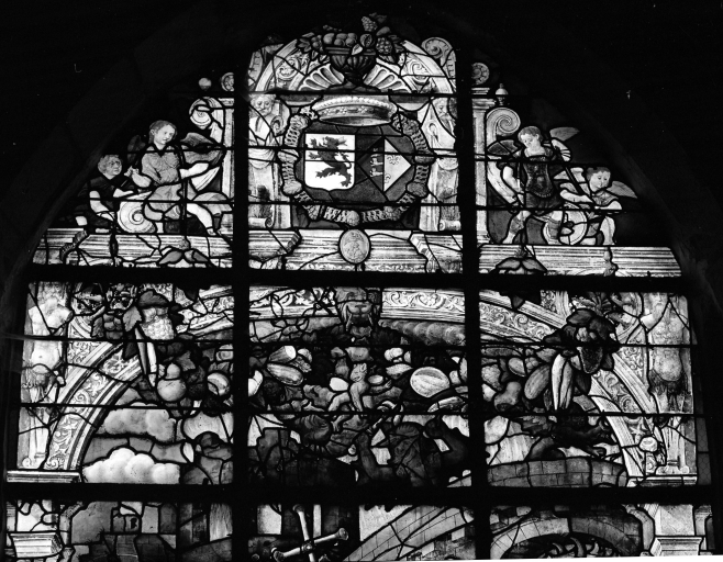 Verrière 3 : Descente aux limbes, détail du registre supérieur (fronton).Immatriculation