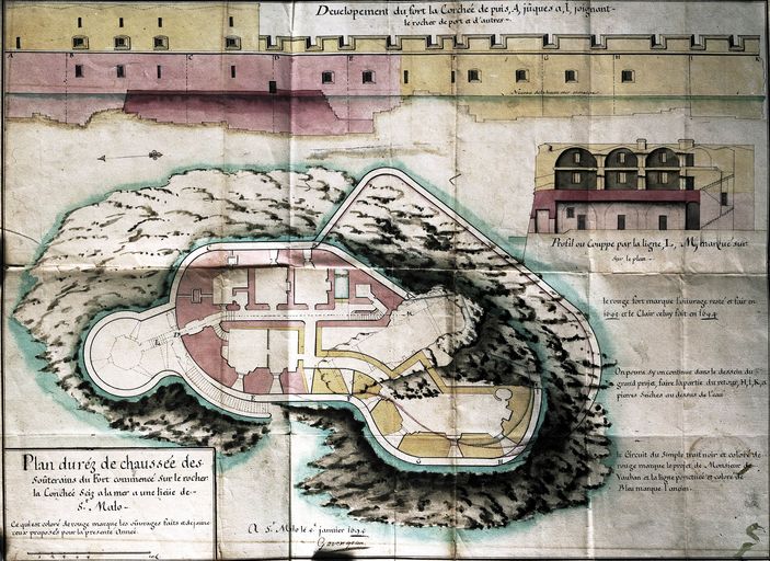 Développement, coupe et plan du rez-de-chausée du fort de la Conchée, fait à Saint-Malo par Garangeau le 5 janvier 1695Immatriculation