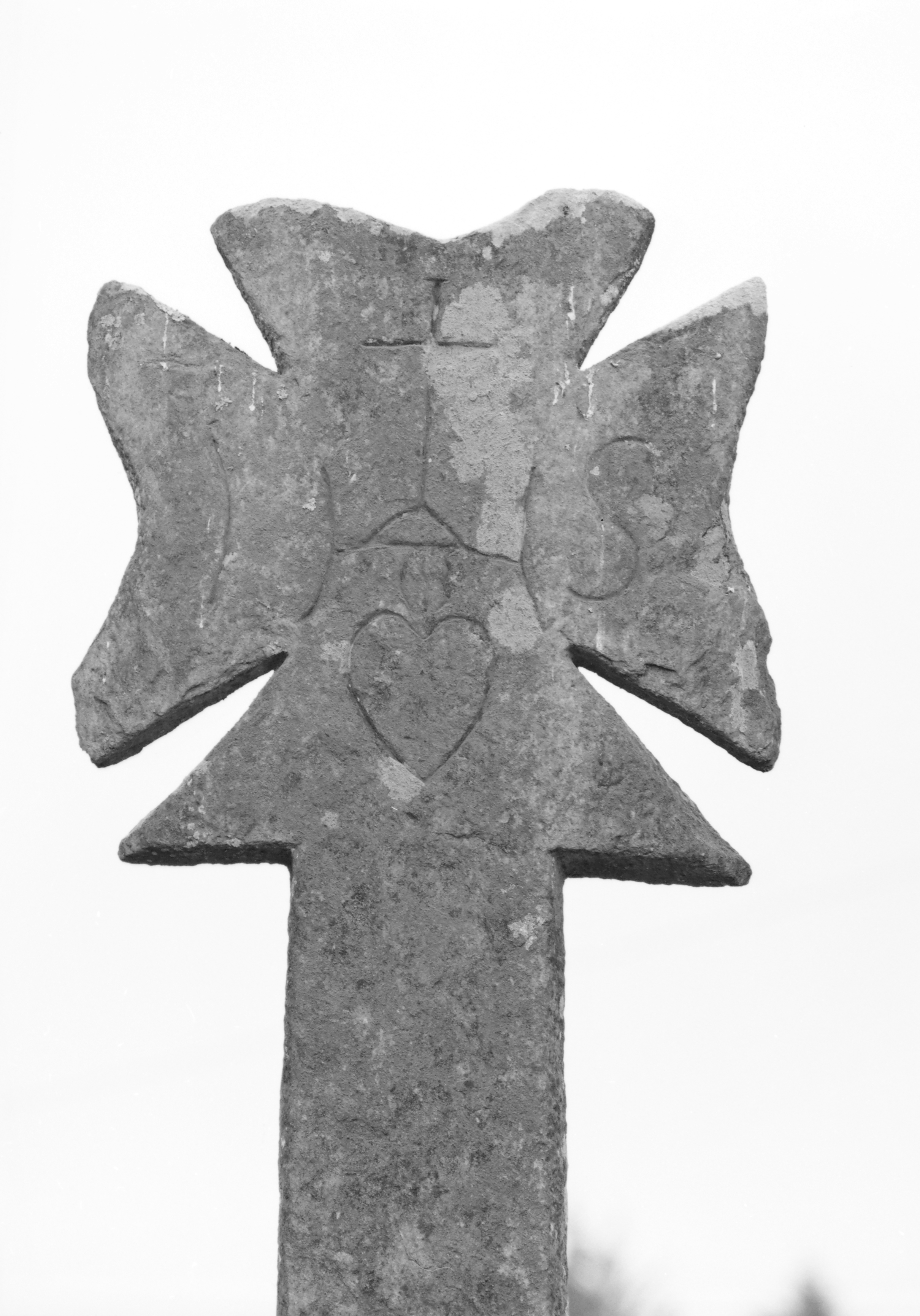Croix de chemin, face est, décor gravé sur la croisée : IHS, une croix et un cœur (état en 1983)Immatriculation