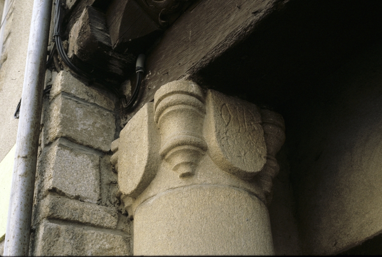 Maison, élévation sur rue, entrée sud : chapiteau de la colonne servant de montant à la porte ; il porte une marque de marchand (état en 1983)Immatriculation