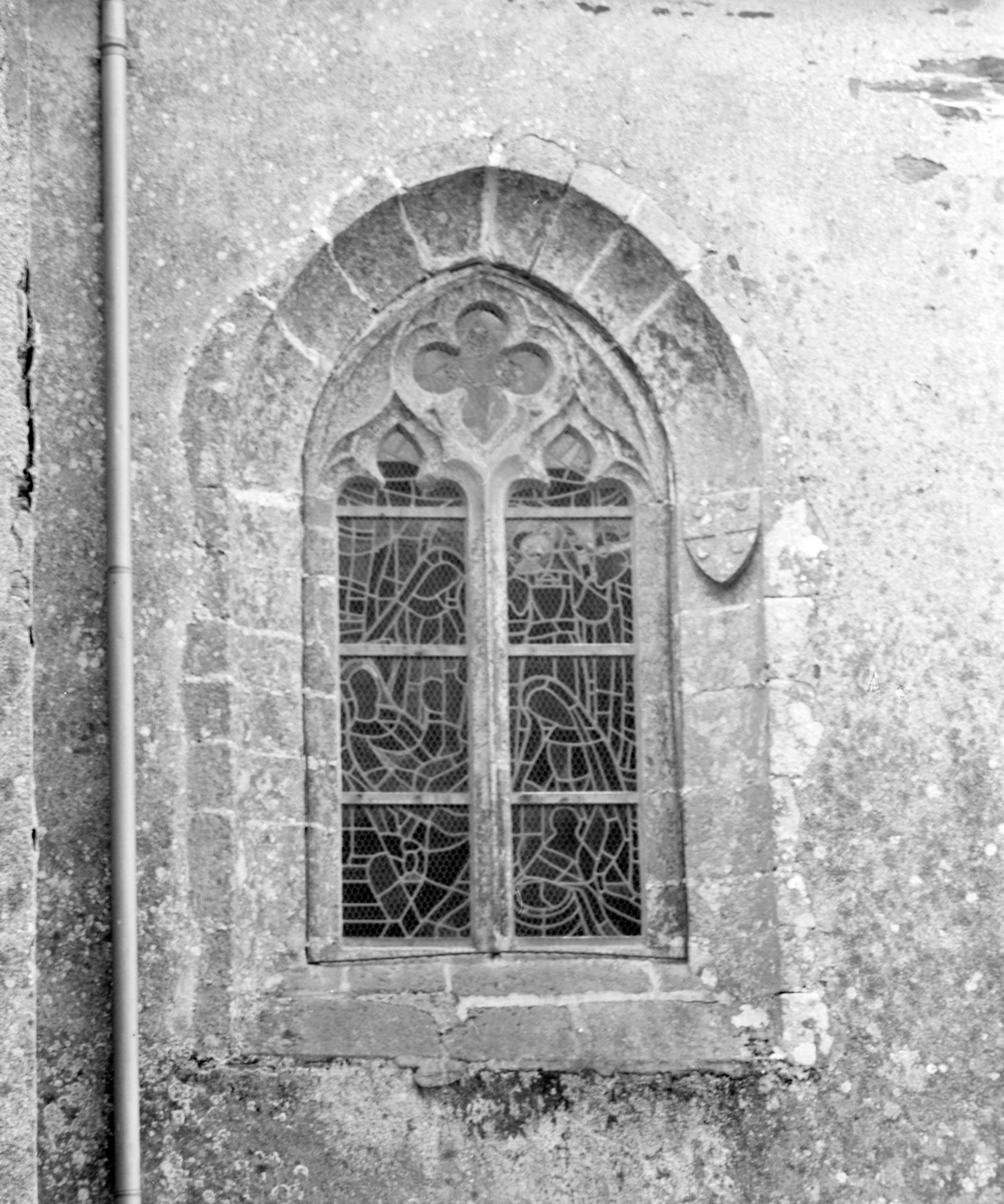Église, transept, bras nord, mur est : baie (état en 1983) ; sur le piédroit droit, on distingue l'écu portant les armoiries de la famille MaignéImmatriculation