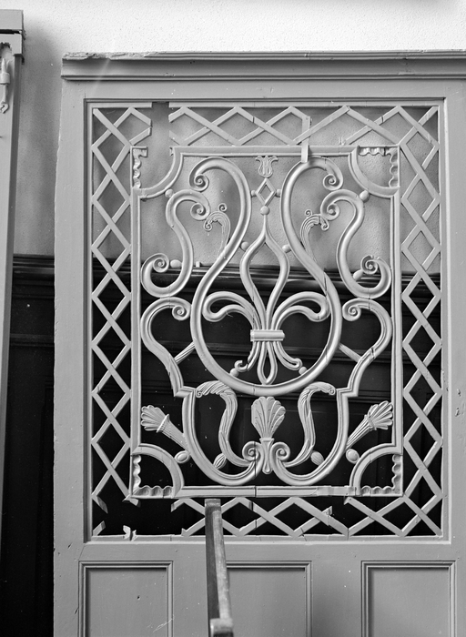 Clôture, détail de la porte.Immatriculation