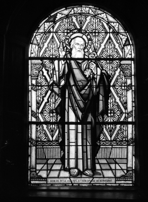 Verrière 1 : saint Pierre ; saint Paul ; saint Joseph (?), Saint Louis, Apparition, Adoration de la Vierge, saint évêque, sainte Thérèse, Baptême du Christ, verrière à personnages, église paroissiale Saint-Pierre, Saint-Paul (Neulliac),