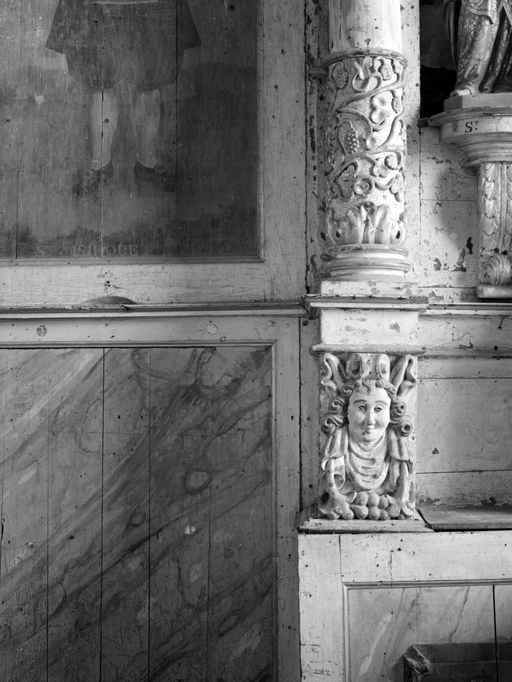 Autel et retable n°2, détail colonne et stylobate gauches.Immatriculation