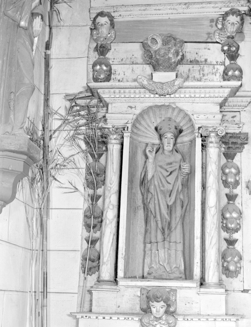 Statue d'un saint Evêque, vue générale avec niche.Immatriculation