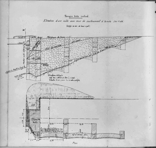 Ligne Saint-Brieuc à Paimpol et Tréguier : terrain très incliné, élévation d'une culée avec mur de soutènement.Immatriculation