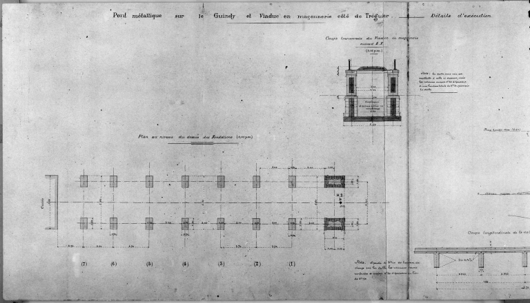 Ligne Tréguier - Lannion : pont métallique sur le Guindy et viaduc en maçonnerie côté Tréguier, plan au niveau du dessus des fondations, coupe transversale au viaduc.Immatriculation