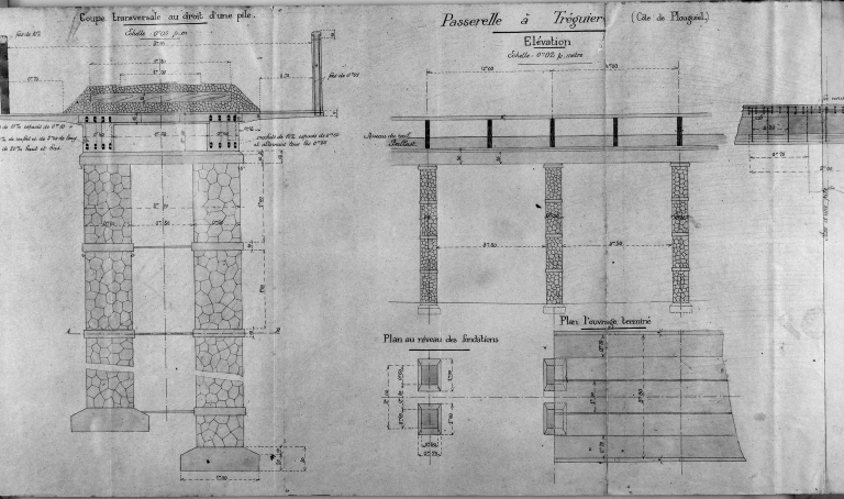 Ligne Tréguier - Lannion : passerelle sur la côte de Plouguiel, coupe transversale au droit d'une pile et élévation, plan au niveau des fondations, plan de l'ouvrage terminé.Immatriculation