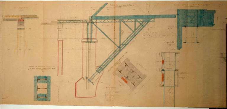 Ligne de Tréguier à Perros-Guirec : pont métallique sur le Guindy et viaduc en maçonnerie côté Tréguier : détail d'une console et de l'attache.Immatriculation