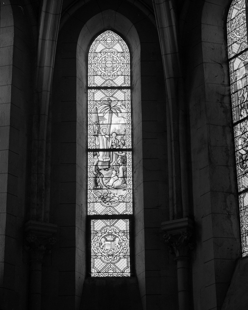 Verrières (8) (verrière historiée, verrière à personnages, rose, verrière décorative) (baies 42, 16, 19, 20, 28, 30, 32), église paroissiale Notre-Dame (Pocé-les-Bois),