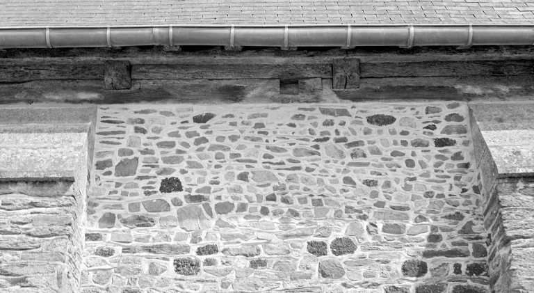 Elévation sud, détail de la sablière au-dessus de la porte.Immatriculation