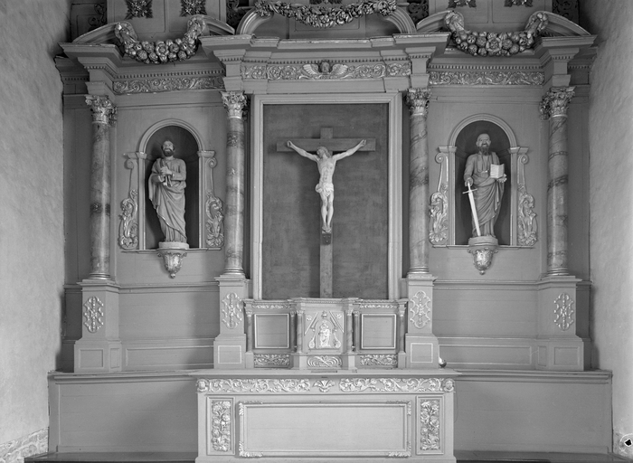 Autel, retable, tabernacle, cadre (maître-autel, retable architecturé, retable à ailes, tabernacle architecturé, tabernacle à ailes), église paroissiale Saint-Pierre, Saint-Paul (Montreuil-sous-Pérouse),