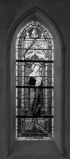 Vue générale du vitrail de la Vierge à l'enfant.Immatriculation