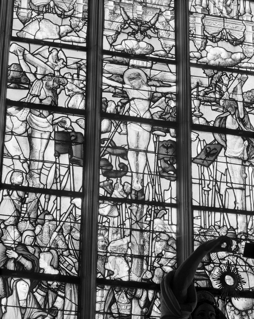 Verrière (maîtresse vitre) : Crucifiement (le), mort de Marie Madeleine, Trinité (baie 0), ancienne collégiale, actuellement église Sainte-Marie-Madeleine (Champeaux),