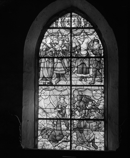 Verrière (verrière hagiographique) : martyre de Sainte Barbe (baie 1), ancienne collégiale, actuellement église Sainte-Marie-Madeleine (Champeaux),