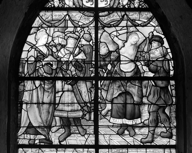 Verrière (verrière hagiographique) : martyre de Sainte Barbe (baie 1), ancienne collégiale, actuellement église Sainte-Marie-Madeleine (Champeaux),