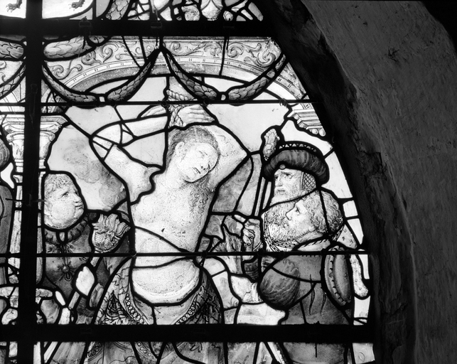 Verrière (verrière hagiographique) : martyre de Sainte Barbe (baie 1), ancienne collégiale, actuellement église Sainte-Marie-Madeleine (Champeaux),