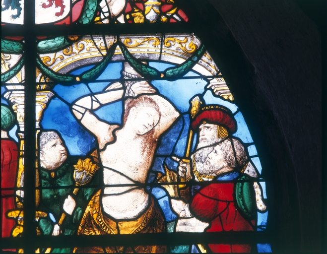 Verrière (verrière hagiographique) : martyre de Sainte Barbe (baie 1), ancienne collégiale, actuellement église Sainte-Marie-Madeleine (Champeaux),