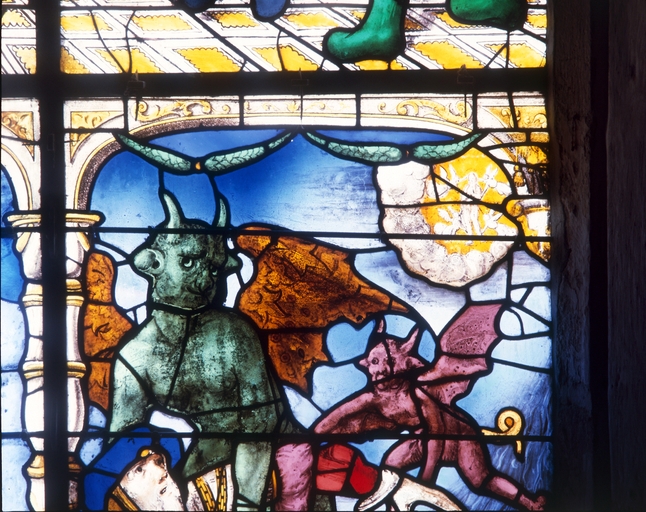 Verrière (verrière hagiographique) : martyre de Sainte Barbe (baie 1), ancienne collégiale, actuellement église Sainte-Marie-Madeleine (Champeaux),