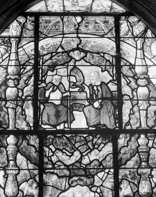 Verrière (verrière figurée) : Pentecôte (baie 8), ancienne collégiale, actuellement église Sainte-Marie-Madeleine (Champeaux),