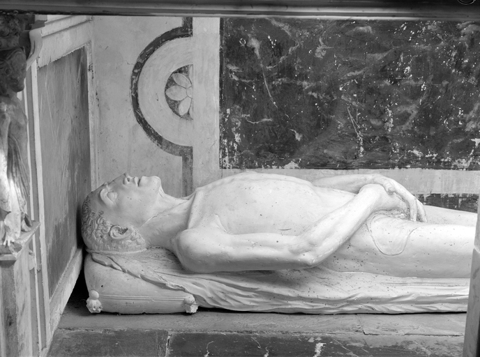 Statue dans tombeau représentant Guy gisant, vue de détail latérale.Immatriculation