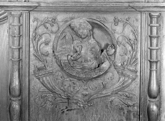 Figure sculptée du dossier.Immatriculation