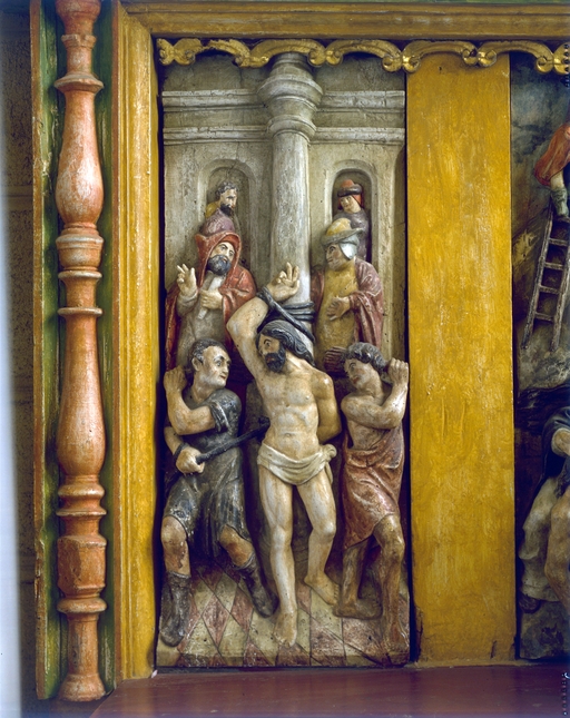 Autel et retable sud, panneau sculpté : Flagellation.Immatriculation