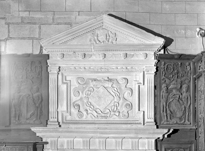 Porte sud de la sacristie, détail du couronnement dans son ensemble avec les deux écussonsImmatriculation