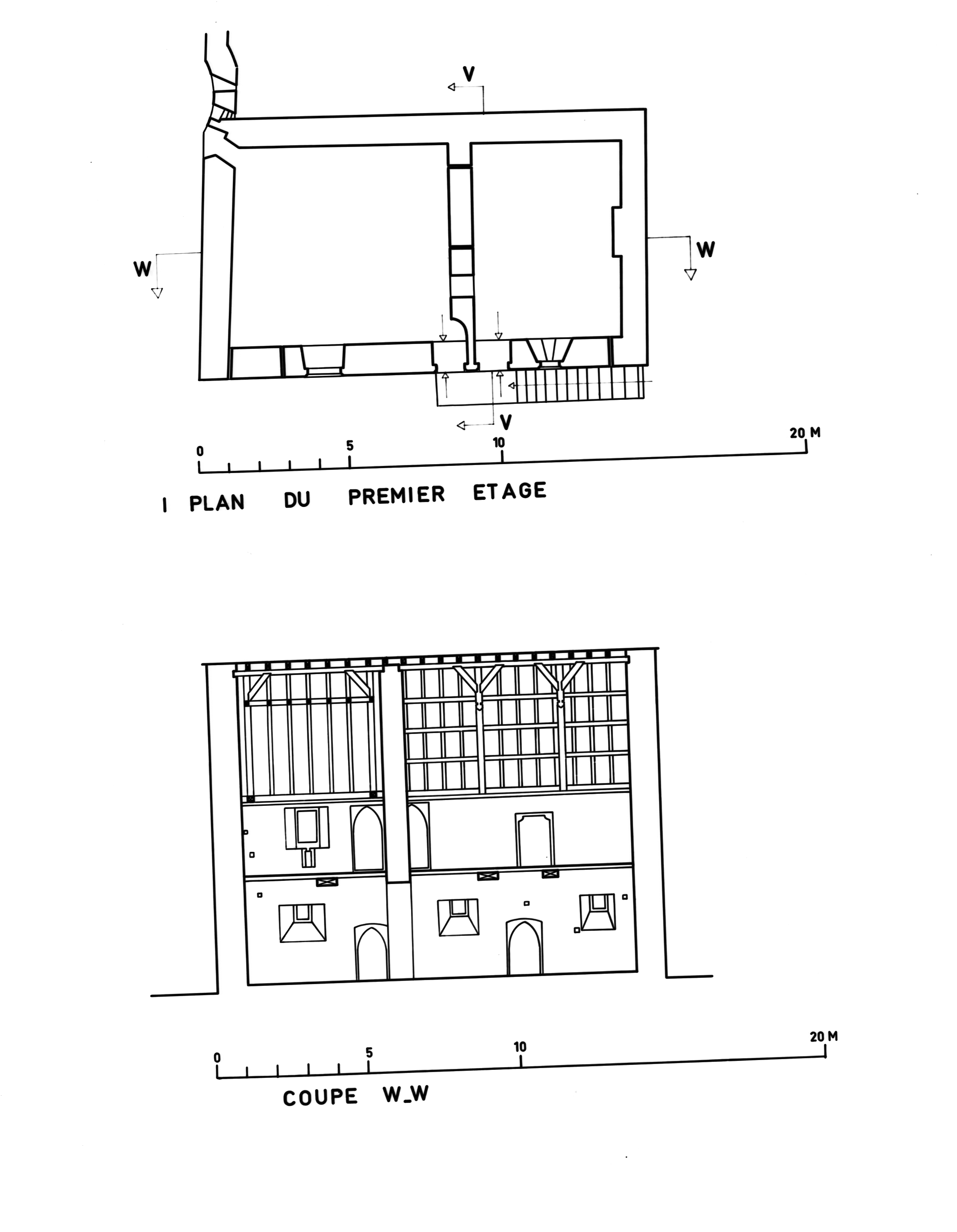 Plan du premier étage et coupe W-W.Immatriculation