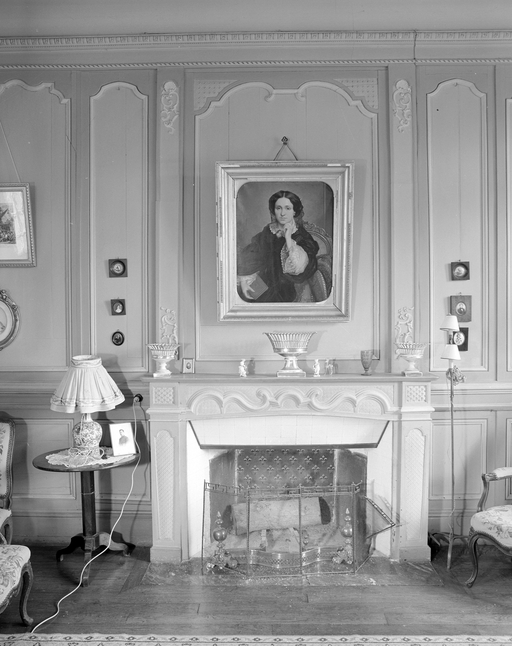 Vue de détail de la cheminée du salon.Immatriculation