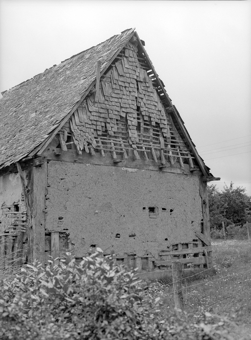 La Touraille. Hangar en pan de bois, détail essentage.Immatriculation
