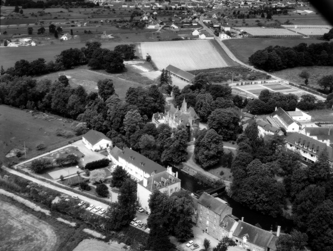 Vue aérienne vers l'est du manoir, de la ferme et de l'ancien moulin.Immatriculation