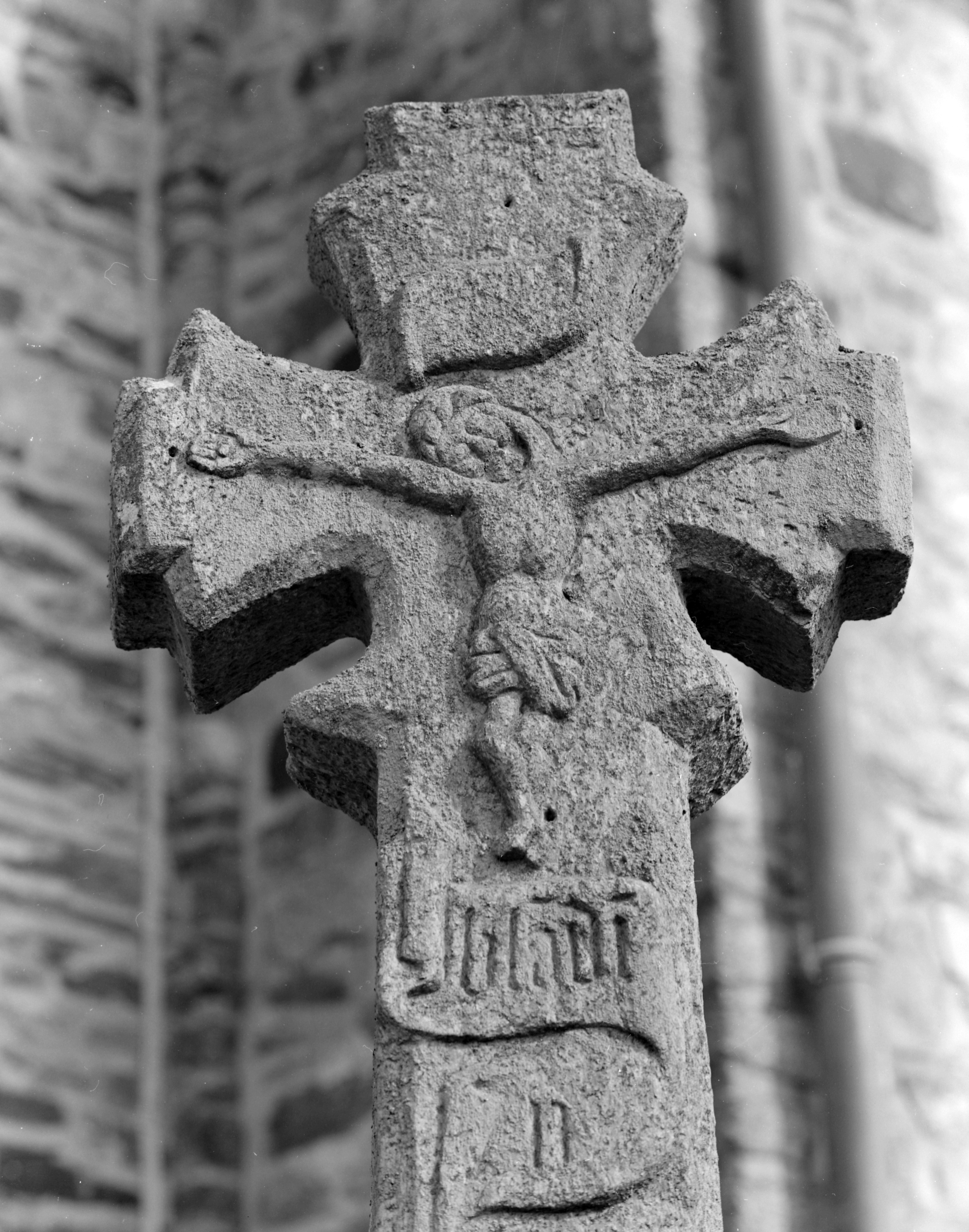 Croix monumentale, partie supérieure de la croix : Christ et inscription (état en 1984)Immatriculation