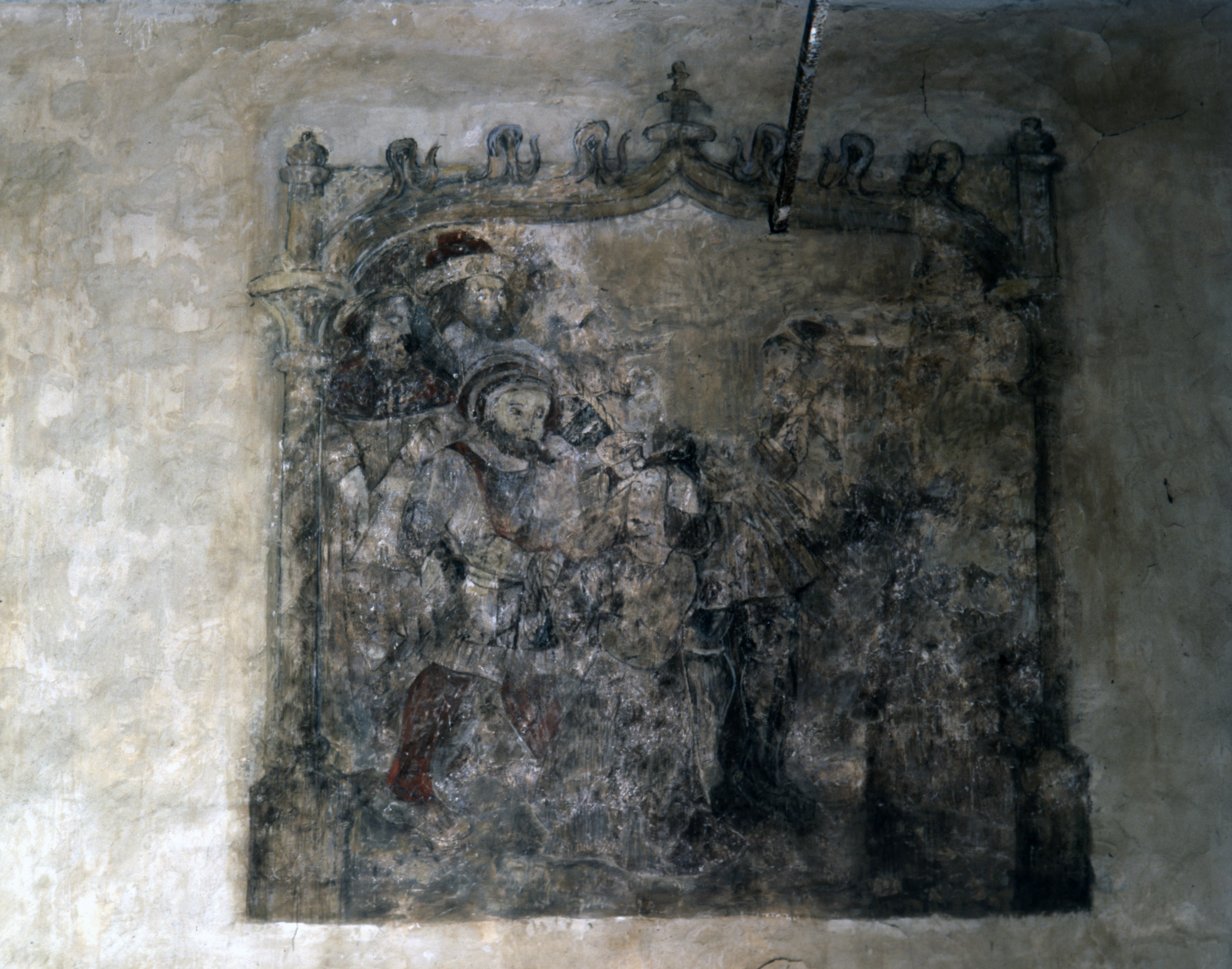 Peinture murale 6 : au premier plan, femme priant à genoux, ligotée (?), des hommes et le notable (état en 1984)Immatriculation