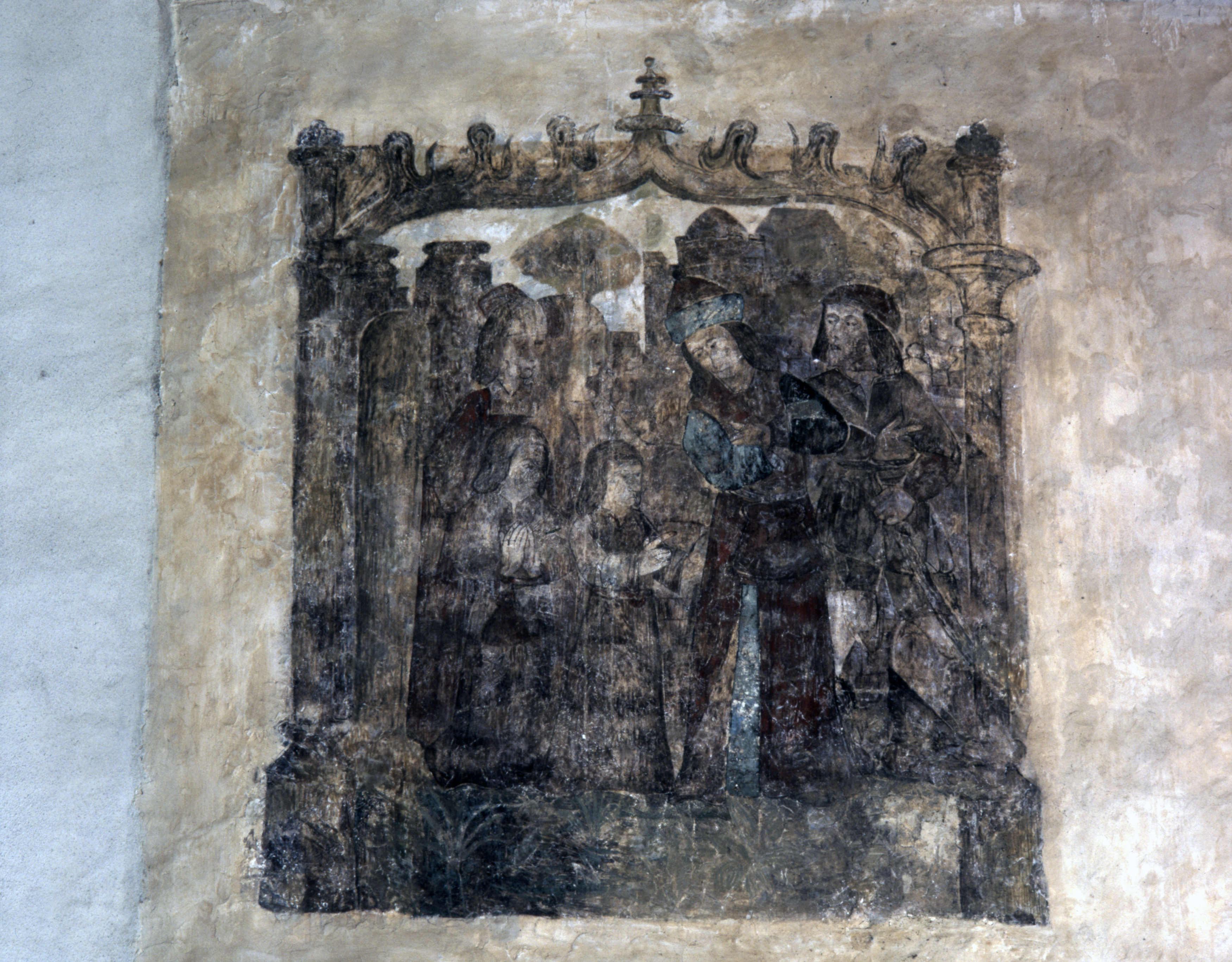 Peinture murale 7 : 6 personnages dont deux en prière ; à l'arrière-plan, une ville (?) (état en 1984)Immatriculation