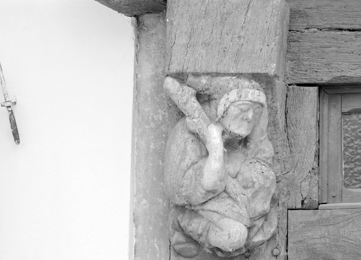 Elévation ouest, rez-de-chaussée, décor de l'aisselier nord : homme endormi au bâton (état en 1984)Immatriculation